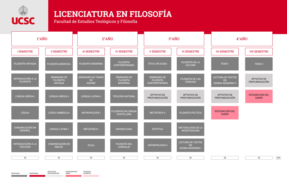 El Licenciado en Filosofía de la UCSC se caracteriza por poseer una formación integral en las competencias intelectuales propias de la filosofía, así como en el estudio de las áreas tradicionales de las disciplinas y la comprensión de su desarrollo histórico, ayudado de un conocimiento instrumental de lenguas clásicas y modernas. Además, se caracteriza por el ejercicio del pensamiento crítico y autónomo, el razonamiento lógico, el análisis de los diversos aspectos de la existencia humana desde una concepción cristiana del mundo y de la vida. Apoyado de esta comprensión histórica y disciplinaria, el Licenciado en Filosofía podrá aportar la perspectiva metafísica y ética-antropológica a los diálogos interdisciplinarios que plantean los dilemas sociales políticos y culturales de la vida en sociedad.